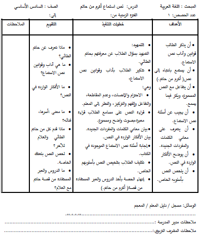 نموذج تحضير درس لغة عربية الصف السادس الابتدائي الفصل الدراسي الثاني 2016