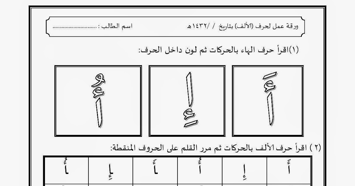 أوراق عمل لحروف الهجاء من أ إلى ي اقرأ واكتب مع أمي