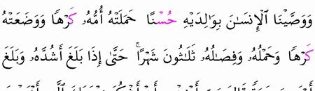 قال الله تعالى و و ص ي ن ا ال إ ن س ان ب و ال د ي ه إ ح س ان ا ح م ل ت ه أ م ه ك ر ه ا و و ض ع ت ه ك ر ه ا و ح م ل ه و ف ص ال ه ث ل اث ون ش ه ر ا ح ت ى إ ذ ا ب ل غ أ ش د ه و ب ل غ أ ر ب ع ين.