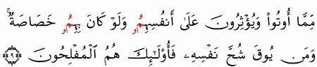 و ال ذ ين ت ب و ء وا الد ار و ال إ يم ان م ن ق ب ل ه م ي ح ب ون م ن ه اج ر إ ل ي ه م و ل ا ي ج د ون ف ي ص د ور ه م ح اج ة م م ا أ وت وا و ي ؤ ث ر ون ع ل ى أ ن ف س ه م و ل و ك ان ب ه م خ ص اص ة و م ن ي وق ش ح ن ف س ه