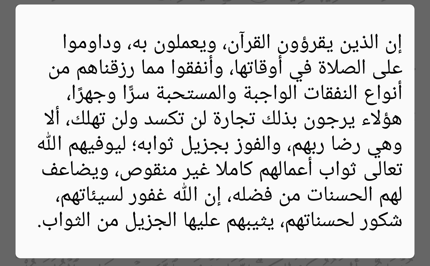تطبيق آية Sur Twitter إن الذين يتلون كتاب الله وأقاموا الصلاة وأنفقوا مما رزقناهم سرا وعلانية يرجون تجارة لن تبور ليوفيهم أجورهم ويزيدهم من فضله إنه غفور شكور فاطر ٢٩ ٣٠